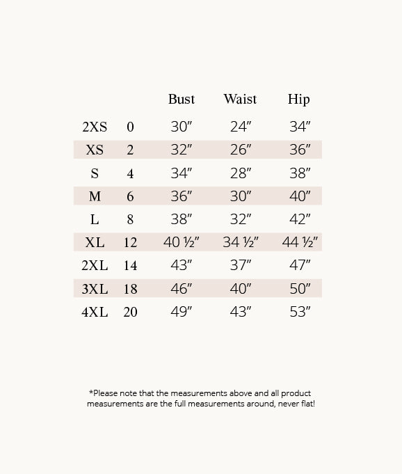Below you will find the size chart that we reference for each body type as we design. Use our How to Measure guide to figure out which size will work best for you, and as always please don't hesitate to reach out to us with any questions!